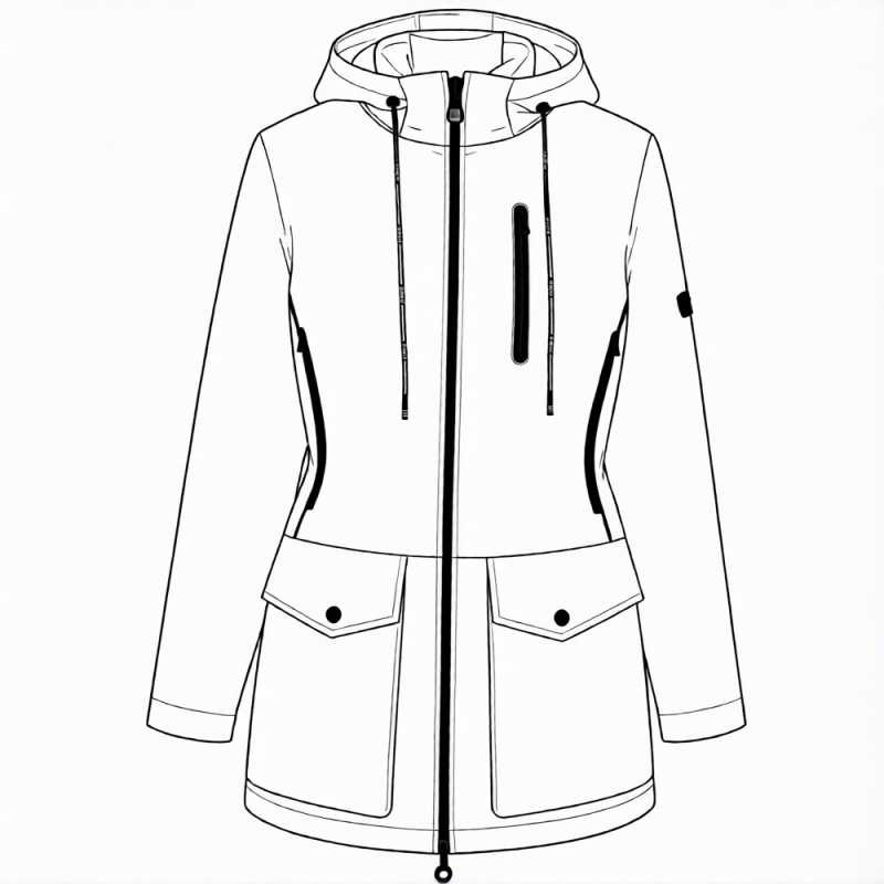 Среднего объёма, немного приталена, передняя часть отрезная ниже талии, рельефы. По спинке утяжка, переход до линии рельефа переда.. Съёмный капюшон на кнопках. Воротник-стойка. По спинке кокетка, переход на плечо.